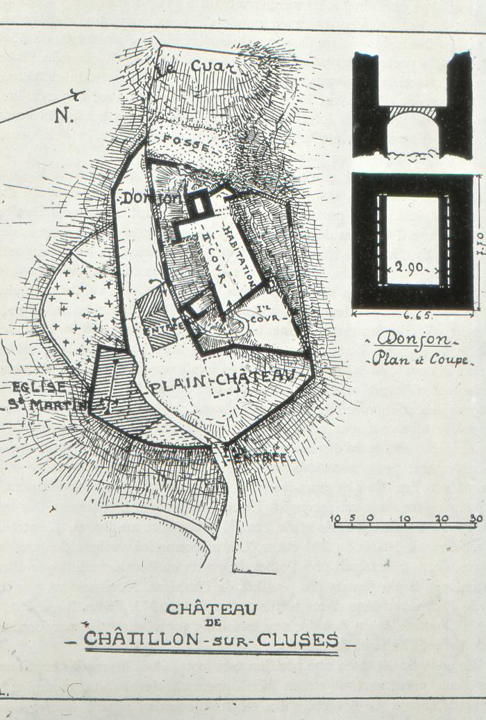 Plan du château et coupe du donjon par BLONDEL. Le château de Châtillon est un ancien château fort, du XIIe siècle, remanié à plusieurs reprises, dont les ruines se dressent sur la commune de Châtillon-sur-Cluses