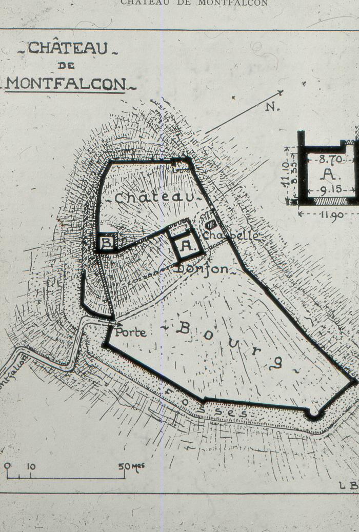 Plan du château de Montfalcon à la Biolle. Depuis le Moyen-âge le château de Montfalcon domine le village de La Biolle. Le comte de Savoie en fit le coeur d'une châtellenie qui allait être, au XIVe siècle, une pièce importante dans le dispositif militaire mis en place contre l'adversaire Genevois. BLONDEL