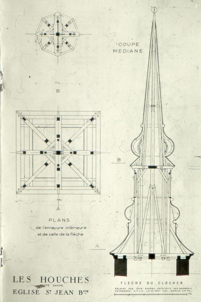 Église Saint-Jean-Baptiste des Houches, construite en 1766. Coupe médiane de la flèche du clocher, plans de l'enrayure inférieure et de celle de la flèche. Jean ROCARD