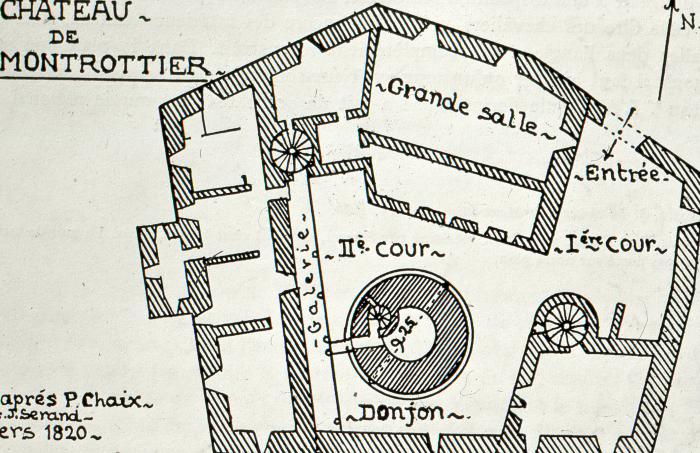 Plan du château de Montrottier, vers 1820. Le château de Montrottier est une ancienne maison forte, du XIIIe siècle, remaniée plusieurs fois et restaurée au XIXe siècle, qui se dresse sur la commune de Lovagny. BLONDEL