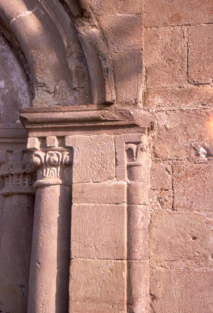 Détail du portail de l'église de Moussy, sur la commune de Cornier: piedroit. Cette église est de style romano-gothique et date du XIIème siècle