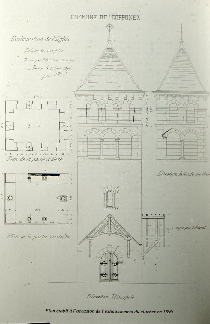 Restauration de l'église de Copponex. Plan établi à l'occasion de l'exhaussement du clocher en 1886. plan de la partie à élever. Plan de la partie existante. Élévation principale. Élévation latérale. Coupe sur l'auvent.