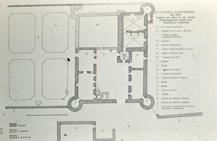 Plan du château d'Etrembières en 1752 d'après un plan et un projet d'aménagement établis par l'architecte CHENEVAL. Le château d'Étrembières est une ancienne maison forte, de la fin du XIIIe siècle ou du début du XIVe siècle, remanié aux XVe et XVIe siècles et restauré au XXe siècle