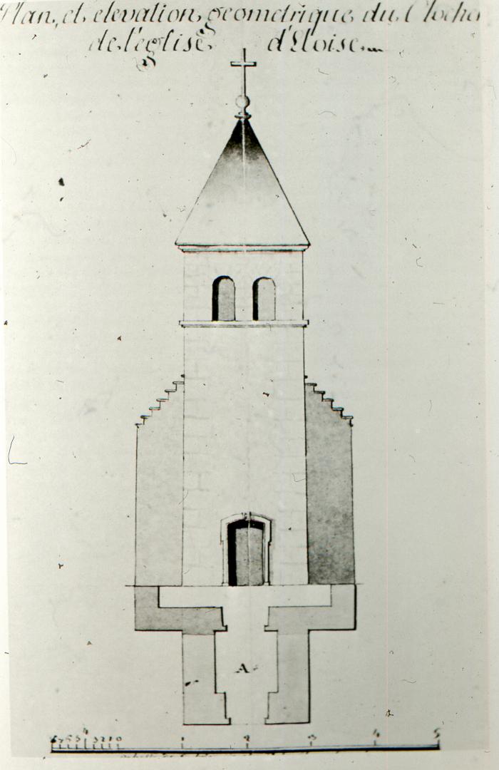 Plan et élévation géométriques du clocher de l'église Saint-Vincent d'Eloise du XVIIIème siècle.