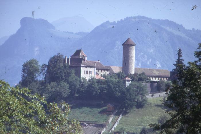Vue générale du château de Faverges. Le château de Faverges est un ancien château fort, du XIIIe siècle, remanié au XVe siècle, situé à la frontière du comté de Savoie et du comté de Genève