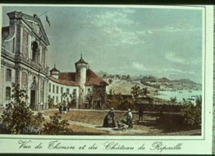 Thonon, gravure colorisée du château de Ripaille et de son église au XIXème siècle