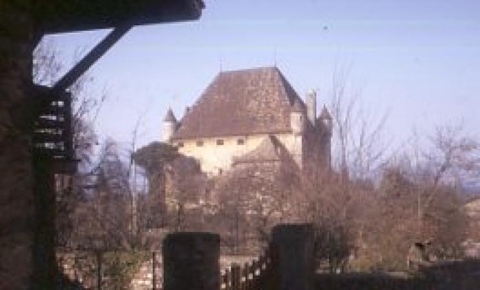 Château d'Yvoire dans son site. Construit à partir de 1306 lors de la fortification du village par le Comte de Savoie Amédée V, le château d'Yvoire avait pour objectif militaire de surveiller la navigation et contrôler la route qui reliait Genève à la haute vallée du Rhône et à l'Italie.