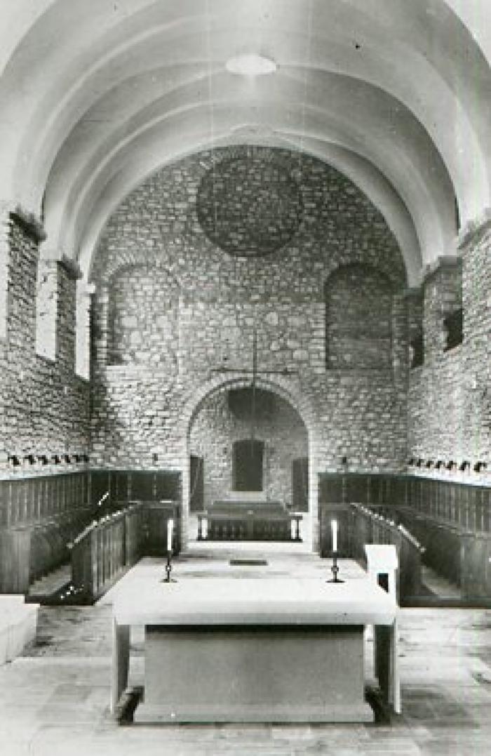 Intérieur du choeur de l'abbaye de Tamié. Nef voûtée. L'abbaye Notre Dame de Tamié est un monastère cistercien-trappiste situé dans le massif des Bauges à 900 m d'altitude, à proximité du col de Tamié, sur le territoire de la commune de Plancherine. Elle fut fondée en 1132. Photographie en noir et blanc.