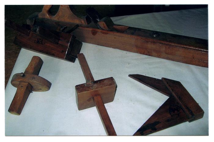 Photographie couleur représentant quatre outils de menuisier: deux trusquins, une équerre et une varlope.