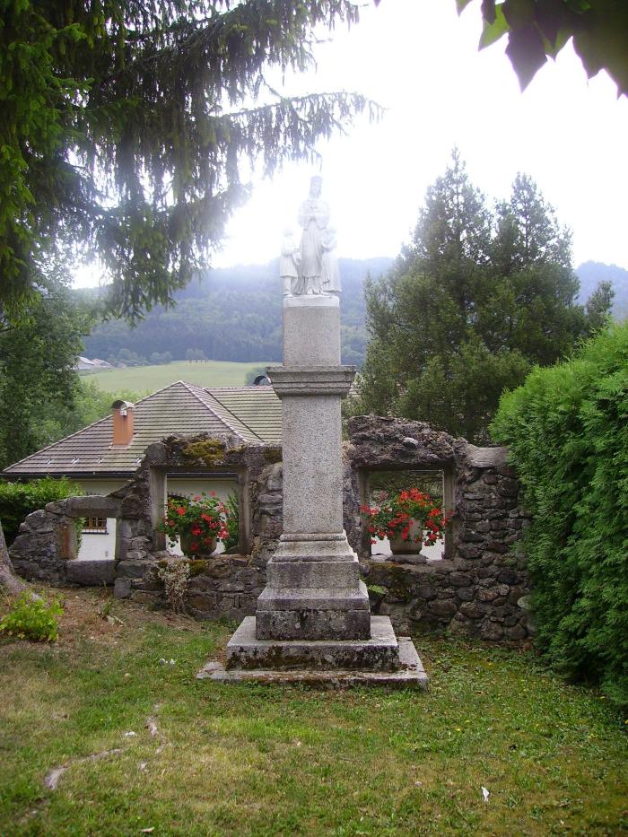 Photographie en couleurs représentant une statue en pierre posée sur une colonne en pierre, elle-même sur un socle à quatre marches sur la commune