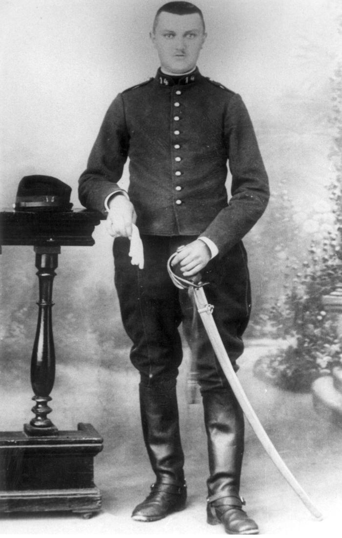 Photographie en noir et blanc de Joseph FREZIER. Il se tient debout, adossé côté droit sur un meuble (son chapeau est posé au-dessus) Il porte une tenue militaire avec bottes cuissardes, pantalon bouffant et épée à la main. Sur son col, il porte l'insigne 14. Il est le père de Joséphine, Lucienne, Rolande, Valentine et Anne-Marie.