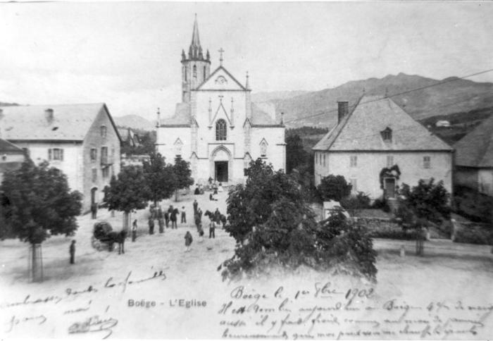 Carte postale de Boëge en 1902. On aperçoit la place, l'église, les habitants et des habitations se situant autour de la place. Travail de documentation réalisé par le GAER, Groupe d'Action pour l'Environnement Rural, la qualité de vie, l'animation à Habère-Poche.