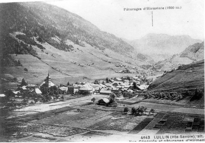 Carte postale offrant une vue des pâturages d'Hirmente et de la commune d'Habère-Lullin. Travail de documentation réalisé par le GAER, Groupe d'Action pour l'Environnement Rural, la qualité de vie, l'animation à Habère-Poche.