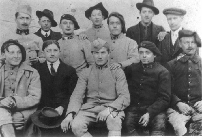 Photographie d'un groupe de personnes à Habère-Poche. Assis - Marcel VAUDAUX, Henri MAMET, Balthazar VAUDAUX, Henri JACQUEMARD, Albert, AILLOUD Debout - Auguste VAUDAUX, Eugène VAUDAUX RUTH, Marcel COLLOMB, Marcel CHASSE, Marcel CHASSE, Henri COTTET, Ulysse FROSSARD, Virgile MAMET.