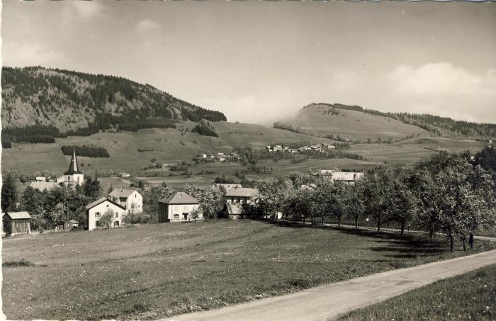 Carte postale, sépia, représentant une vue générale dans les années 50 de la commune d'Habère-Poche.