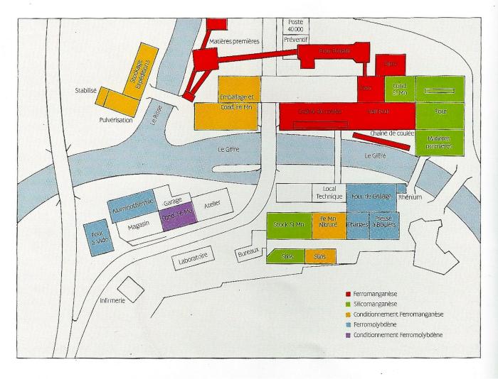 Plan en couleur de l'usine du Giffre. On remarque le Giffre et le Risse qui traversent le site. Chaque construction est matérialisée par un rectangle de couleur.