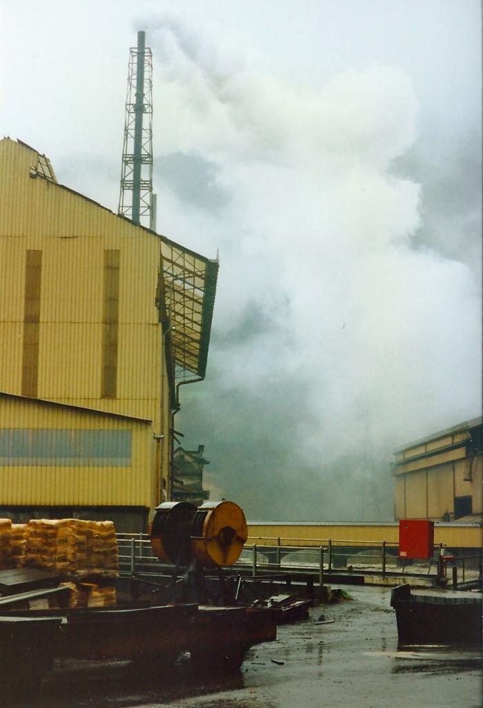 Photographie en couleur représentant l?extérieur de l'usine du Giffre. Elle montre précisément l'angle d'un bâtiment avec sa cheminée monumentale qui fume.