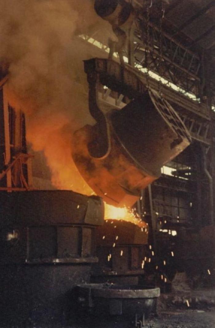 Photographie en couleur représentant l'intérieur de l'usine du Giffre. Elle montre précisément l'étape de la coulée. L'usine du Giffre était située entre Saint-Jeoire-en-Faucigny et Marignier.