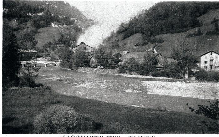 Carte postale en noir et blanc représentant au premier plan le Giffre et en arrière-plan les usines.