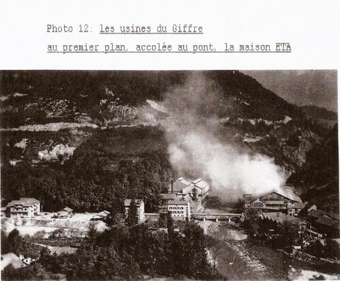 Photographie en noir et blanc représentant une vue générale de l'usine du Giffre. On remarque l'usine, le pont et la vallée du Giffre. Le batiment sur la gauche appartenait à la famille BORCA qui y louaient des chambres. Le cliché est légendé «"Les usines du Giffre au premier plan accolée au pont : la maison ETA." Fiche aimablement complétée par A. MAGLIOCCO