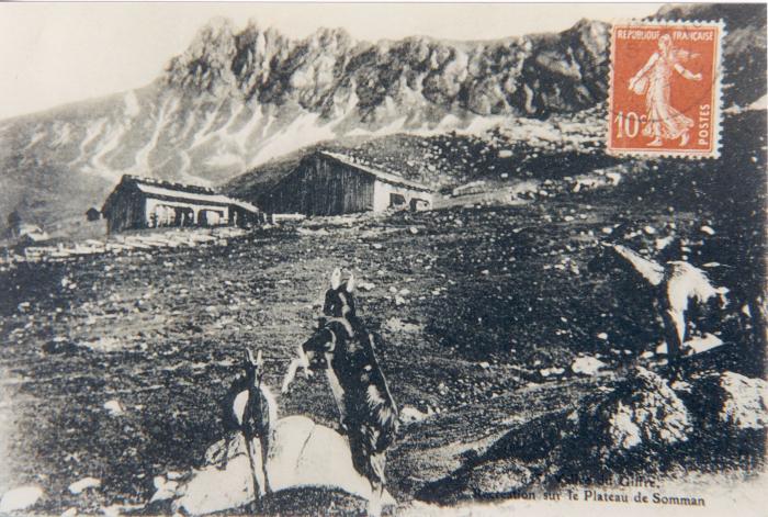Carte postale ancienne, noir et blanc, montrant des chèvres cabriolant sur le plateau de Sommand et deux chalets d'alpage.
