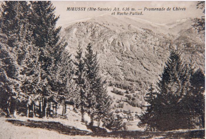 Carte postale ancienne, sépia, montrant la promenade des chères à Mieussy et Roche Pallud.
