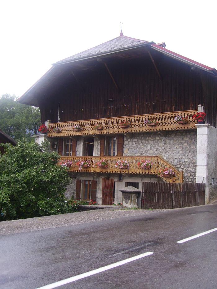 Photographie, en couleurs, représentant une maison privée (Famille Chavanne) sur la commune d'Onnion, au lieu-dit Laitraz. Il s'agit d'une maison avec un balcon ouvragé en bois.