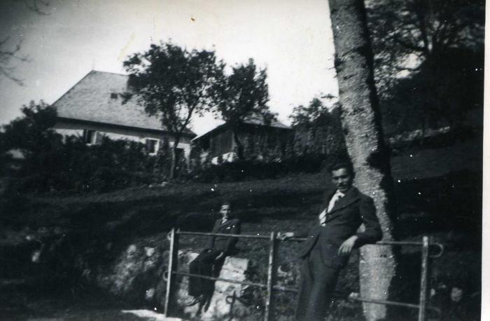 Photographie en noir et blanc représentant Emmanuel et Gervais CHAVANNE sur le pont qui mène au hameau de Barbey. En arrière plan le Château de Barbey.