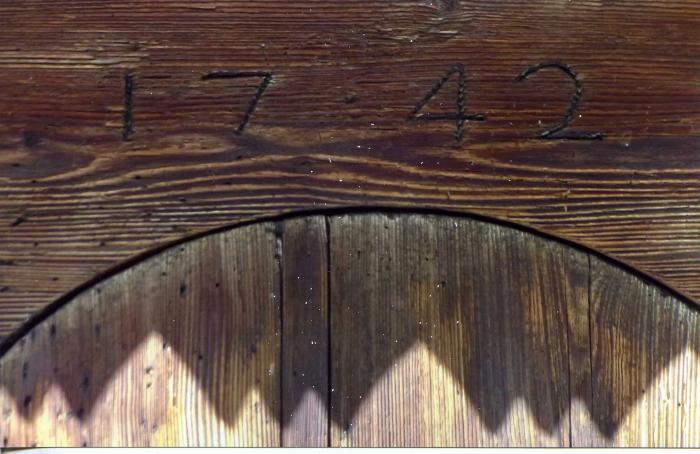 Photographie en couleur représentant un détail d'un grenier situé dans le hameau de Matringes à Mieussy. Ici 1742 signifie la date de construction de cet abri.