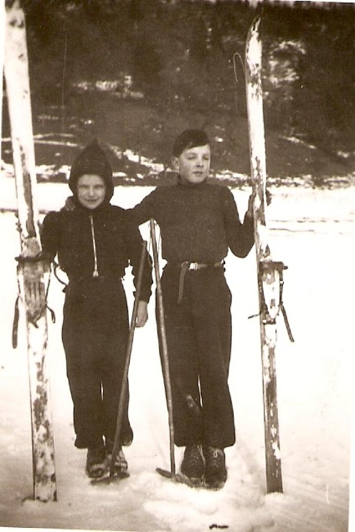 Photographie en noir et blanc prise vers 1948 à la Léchère à Onnion. Nicole FAVRE et Maurice DE DONA ont chacun une paire de skis et de bâtons en bois.