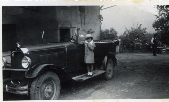 Une petite fille vêtue d'un manteau et coiffée d'un chapeau, pose sur le marche-pied d'une voiture décapotée, devant la maison de la famille PELLET-MOREL à Peillonnex.