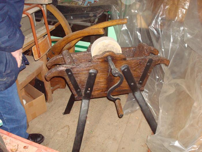 Meule avec coffrage en bois et pied en métal. Elle est actionnée à l'aide d'une manivelle afin d'aiguiser les outils. Elle provient de Saint-Jean-de-Tholome.