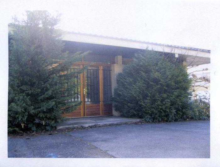 Cette photographie couleur représente l'entrée de l'ancien bâtiment des douanes situé au 17 bis route de Thairy à Saint-Julien en-Genevois (en face du lycée). Ce bureau a fermé aux alentours de 2007.