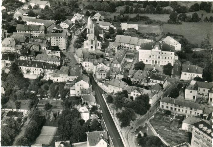 Cette photographie en noir et blanc représente une vue aérienne du centre ville de Saint-Julien-en-Genevois. Au centre de la photo, on aperçoit la route d'Annemasse avec ,sur sa gauche, l'hôtel de France et ,sur sa droite, la place du Crêt. En direction du centre ville, l'Hôtel du cheval Blanc (en bout de route) puis la place de la Poste. Dans l'alignement de l'hôtel : l'Eglise. On note la forte proportion de fermes et de champs dans son environnement proche. Sur la droite et de bas en haut : le lycée (premier bâtiment en bas à droite), la gendarmerie (troisième bâtiment), le collège (dernier bâtiment avant la route). De l'autre côté de cette route sur la gauche : l'imposant édifice de l'hôtel de ville et la Place de la Mairie. En bas à gauche, une zone de verdure avec un terrain de tennis.