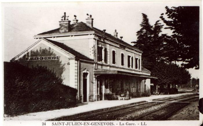 Photographie en noir et blanc représentant le bâtiment de la gare de Saint-Julien-en-Genevois tel qu'il apparaissait au voyageur depuis le quai, en 1939. Au corps du bâtiment principal sont accolées deux annexes. Un haut vent situé au dessus de l'entrée apporte de l'ombre aux passagers. Sous ce dernier, on devine un homme avec des paquetages. Un peu plus loin, on observe des charriots à bagages.