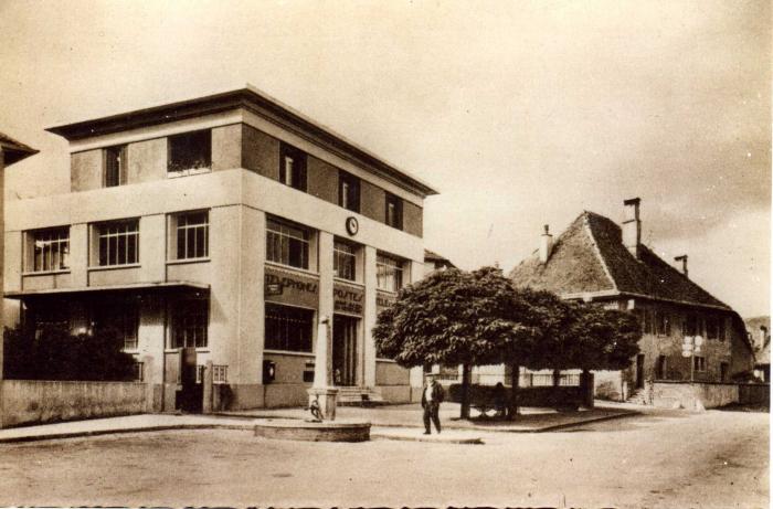 Photographie en noir et blanc représentant La Poste de Saint-Julien-en-Genevois. Ce bâtiment fut édifié en 1931 à l'emplacement de l'ancienne église. Le précédent bureau était installé dans l'église désaffectée. A l'emplacement des places de stationnement actuelles (en 2013) des arbres apportent de l'ombre devant le bâtiment. Sur la gauche, on observe la fontaine municipale qui a changé d'emplacement à trois reprises. A droite, une vieille maison disparue aujourd'hui : un immeuble en arrondi s'élève à sa place.