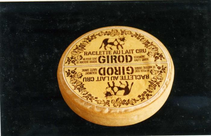 Cette photographie couleur représente un fromage de raclette au lait cru Girod. Il est présenté non emballé avec un autocollant de présentation indiquant son nom, sa méthode de fabrication et son origine géographique. Le tout est illustré. Ce fromage pèse environ 5.5 kg pour un diamètre de 30 cm et une épaisseur de 6 cm.