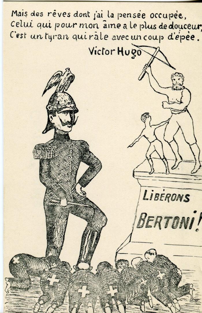 Carte postale suisse, pour exiger la libération de Luigi BERTONI emprisonné à Zurich en 1912 après avoir été faussement dénoncé par un employé du consulat d'Italie. En haut de la carte figure une citation de Victor HUGO: « Mais des rêves dont j'ai la pensée occupée, celui qui pour mon âme a le plus de douceur, C'est un tyran qui râle avec un coup d'épée ». En bas nous voyons une caricature des notables suisses agenouillés devant le prussien et monument de Guillaume TELL, sur lequel est écrit "Libérons Bertoni! ».