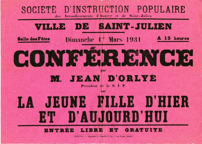 Affiche de la conférence organisée par la société d'instruction populaire, le 1er mars 1931. Le conférencier est monsieur Jean d'ORLYE.