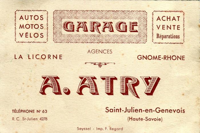 Buvard publicitaire du garage ATRY, à Saint-Julien-en-Genevois