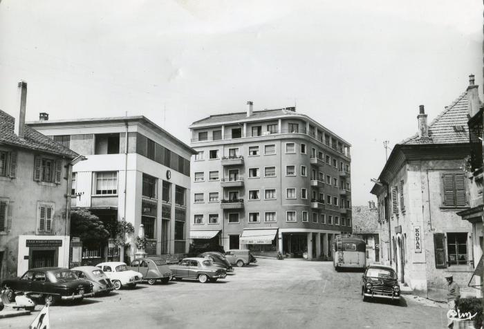 Cette carte postale noir et blanc de la place de la poste (à gauche de l'image) au début des années 60.