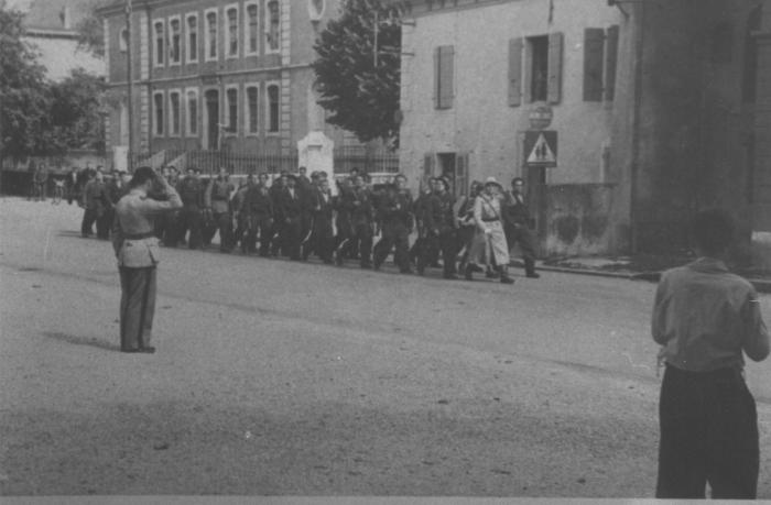 Photographie noir et blanc du défilé des FFI à la fin de la deuxième guerre mondiale, à Saint-Julien-en-Genevois