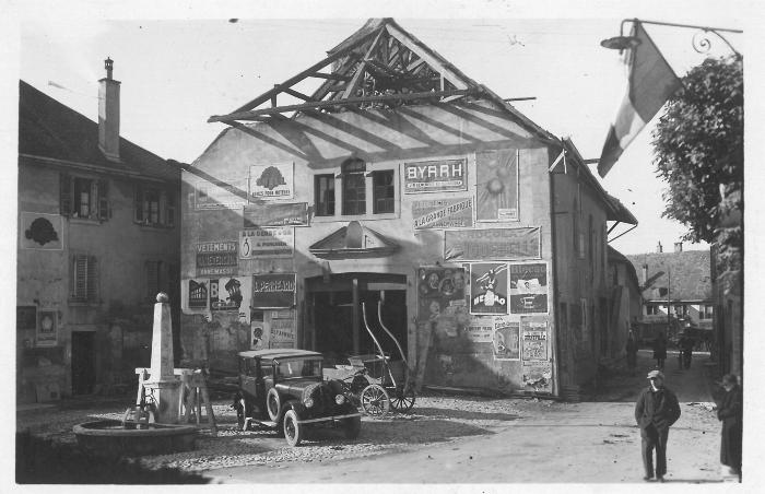 Photographie de la place devant la poste actuelle (à l'emplacement de l'ancienne église) à Saint-Julien-en-Genevois. On distingue la fontaine.