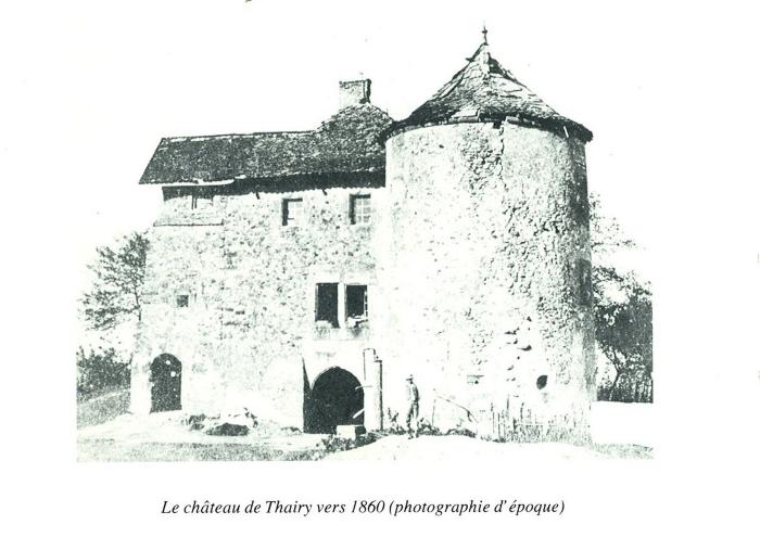 Photographie d'époque représentant le château de Thairy vers 1860. Le château de Thairy a appartenu aux seigneurs de BELLERIVE (XVIème siècle) puis aux nobles de la Salle-sur-Villard (au XVIIème siècle)