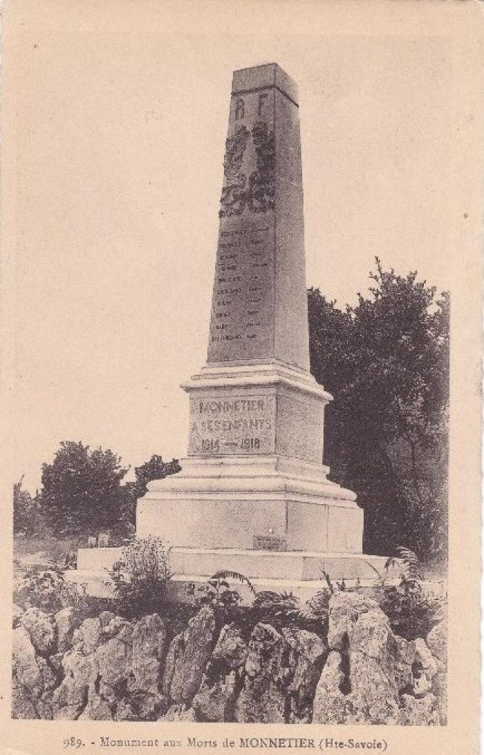 Carte postale en noir et blanc, représentant le monument aux morts de la commune de Monnetier. La vue est une contre-plongée. Elle est inscrite sous le numéro de série 989.