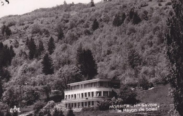 Carte postale en noir et blanc, représentant un établissement nommé « Le rayon de Soleil » à Mornex. l'éditeur est L.A.C.E