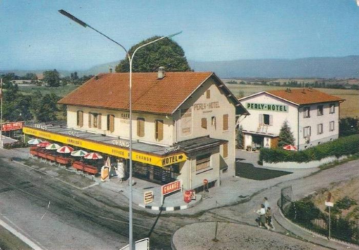 Carte postale en couleur représentant le Perly-Hôtel. l'établissement était composé de deux bâtiments, proches de la douane de Perly à Saint-Julien-en-Genevois.