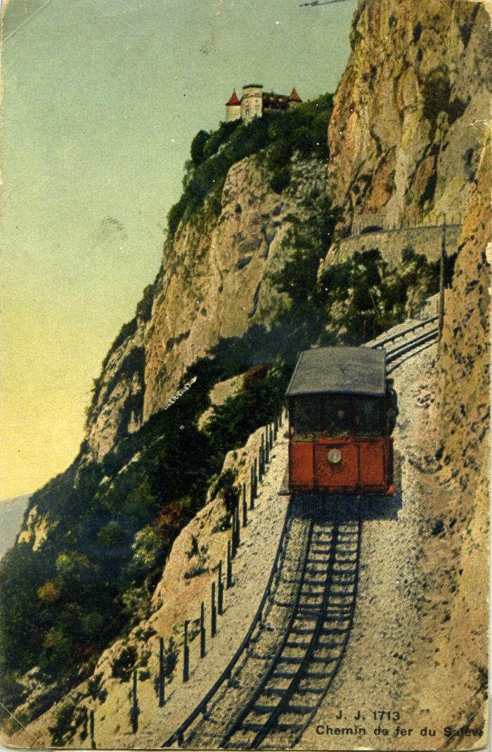 Carte postale colorisée représentant la ligne de chemin de fer du train à crémaillère du Salève. Au loin, on aperçoit le château de Monnetier.