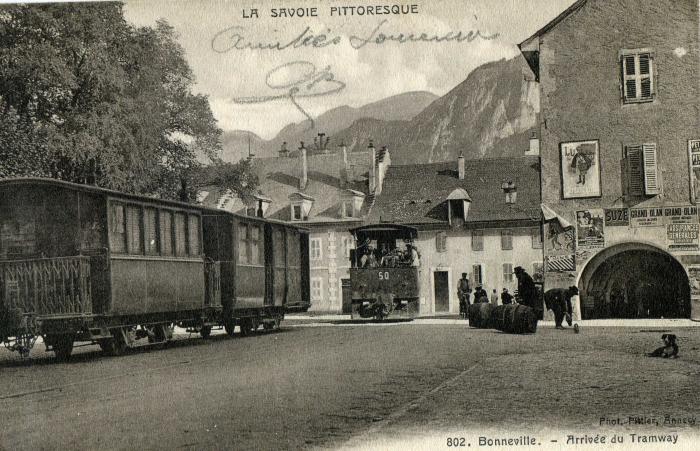 Carte postale en noir et blanc représentant la place à Bonneville. Deux voies de tramways sont utilisées. En arrière plan, on aperçoit un tramway qui arrive avec des usagers. En même temps, des personnes sont à proximité de tonneaux. Ces derniers sont couchés sur la chaussée.