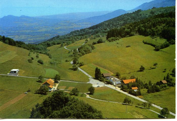 Grâce à cette vue de Saxel on peut voir à la fois le café qui est la maison blanche, d'anciennes fermes et la route menant au Mont Béné.